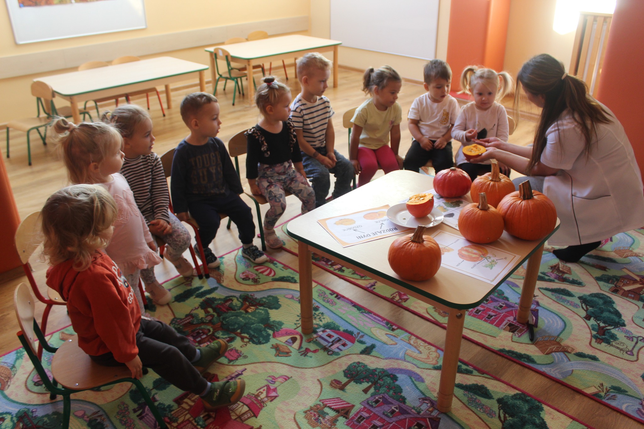 Nasi Żłobkowicze wykonali kolejne zadanie w ramach projektu "Witaminki". W październiku był to „Dzień ogórka”. Improwizacja ruchowa do piosenki "Ogórek wąsaty", zajęcia matematyczne z porównywania wielkości różnych ogórków oraz degustacja tego warzywa to przygotowane atrakcje na ten dzień. Kolejnym takim dniem był Dzień Dyni zapoznaliśmy dzieci z tym wartościowym warzywem. Podczas zajęć dzieci mogły poznać wielką różnorodność dyń oraz wzbogacić wiedzę na ich temat. Dowiedziały się, że dynia jest bardzo zdrowym warzywem i że można z niej przygotować wiele dań tj.: pieczywo, zupę, dżem, ciasto, babeczki, przetwory i soki. Następnie przystąpiliśmy do dyniowych zabaw: klasyfikowania dyń wg wielkości i koloru.