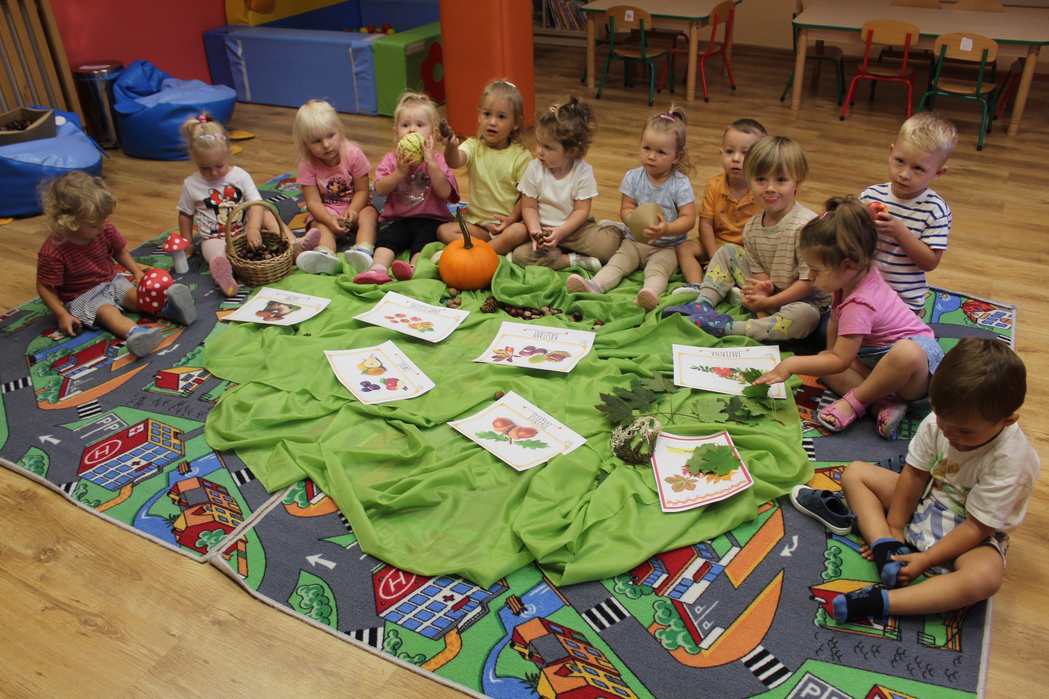 Październik to miesiąc, który przynosi ze sobą wiele fantastycznych darów, które idealnie nadają się do zabaw sensorycznych, a dokładniej do „Spaceru po lesie”. Dzieci zbierały jesienne niespodzianki, a przy okazji stymulowały swoje zmysły. Podczas zabawy dzieci kształtowały koordynacje wzrokowo-ruchową oraz motorykę ciała. Jeśli tylko pogoda pozwalała, chodziliśmy na wspólne spacery, a nawet bywaliśmy na dłuższych zabawach na świeżym powietrzu. Żłobkowicze mieli również okazję zrealizować kolejne witaminowe wyzwanie, a mianowicie poznały Kapustę Kamę oraz Cukinię Celestynę.
