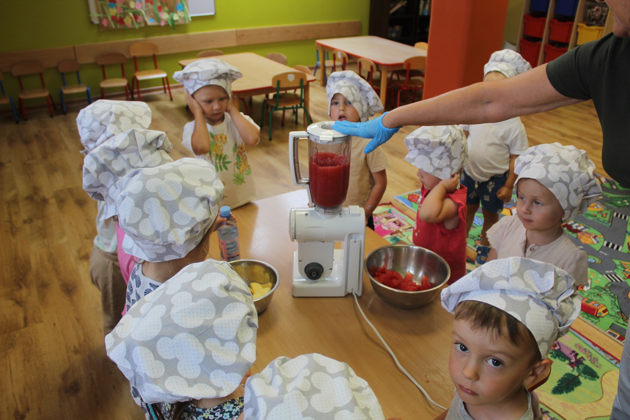Miesiąc maj to czas realizowanych treści związanych z mieszkańcami łąki. Przypominaliśmy i utrwalaliśmy wiadomości o zwierzętach mieszkających na łące i ich charakterystycznych cechach. Dzieci chętnie uczestniczyły w zabawach integracyjnych, muzyczno-ruchowych, plastycznych. Kontynuowaliśmy również „Kuchcikowo”, cykliczne zajęcia prowadzone w naszej placówce. Podczas zajęć przygotowaliśmy wodę smakową z cytryną i miętą oraz zdrową i pyszną sałatkę owocową.
