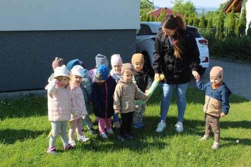 Celebrując w miesiącu maju „Dzień Mamy” i „Dzień Rodziny” dzieci wykonały piękne prace plastyczne pt. „Portret mojej mamy” oraz „Serce dla mamy i taty”. W miesięcznym planie pracy żłobka nie zabrakło także wielu zajęć dydaktycznych, rytmicznych, badawczych, sensorycznych i ruchowych m.in. z wykorzystaniem kształtek rehabilitacyjnymi. Zostało również zorganizowane kuchcikowo, podczas którego dzieci mogły same wycisnąć sok z jabłek i marchewki.