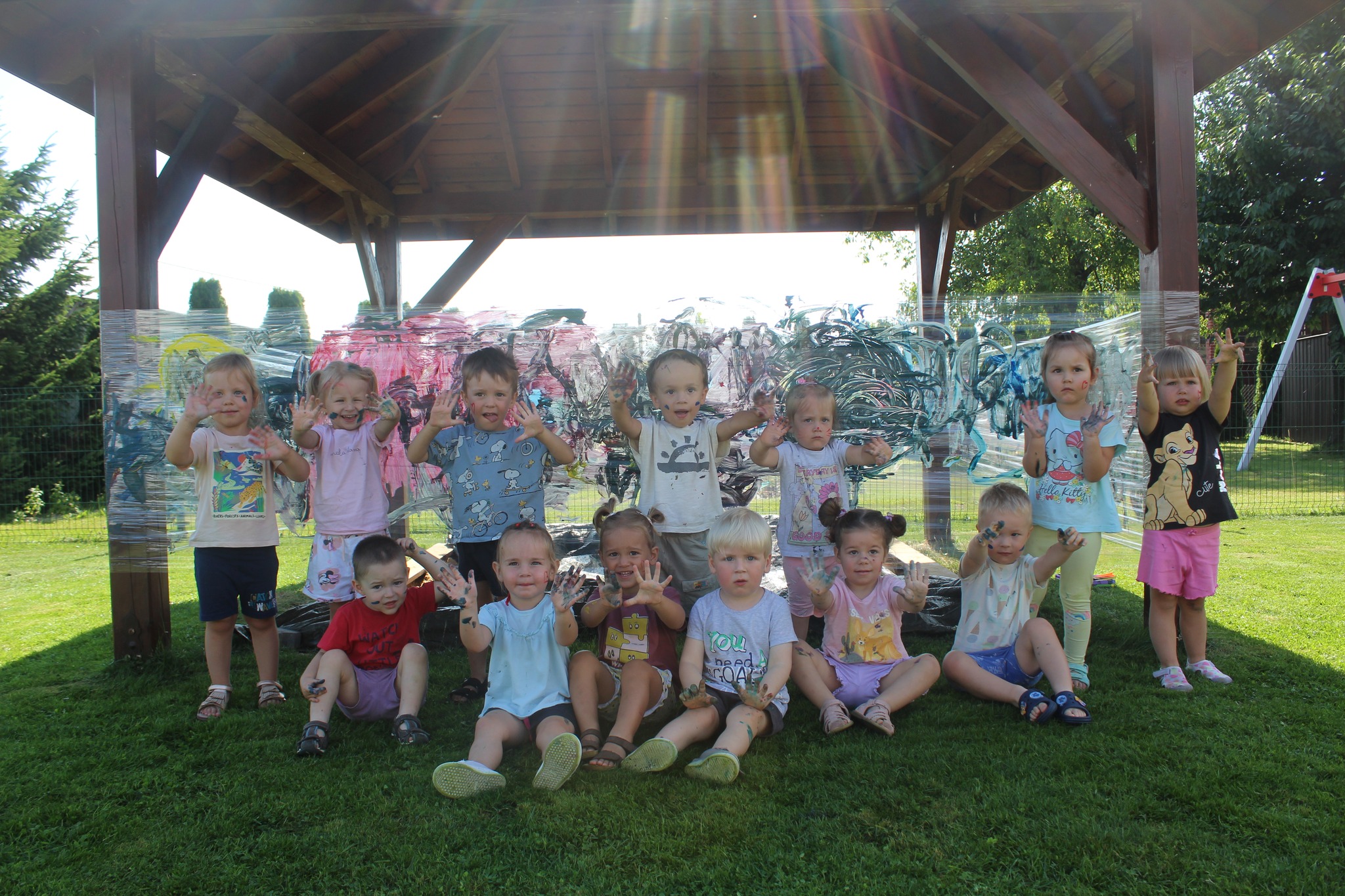 Z okazji Dnia Dziecka w naszej placówce zostały zorganizowane warsztaty plastyczne na świeżym powietrzu. Specjalnie przygotowana do tego przestrzeń ( zastreczowane duże elementy placu zabaw) pozwoliła żłobkowiczom na swobodną zabawę i działania plastyczno – sensoryczne. Podczas zajęć każdy mógł puścić wodze fantazji i będąc wiernym zasadzie „ brudne dziecko to szczęśliwe dziecko” dzieci stymulowały zmysł dotyku oraz wzroku.