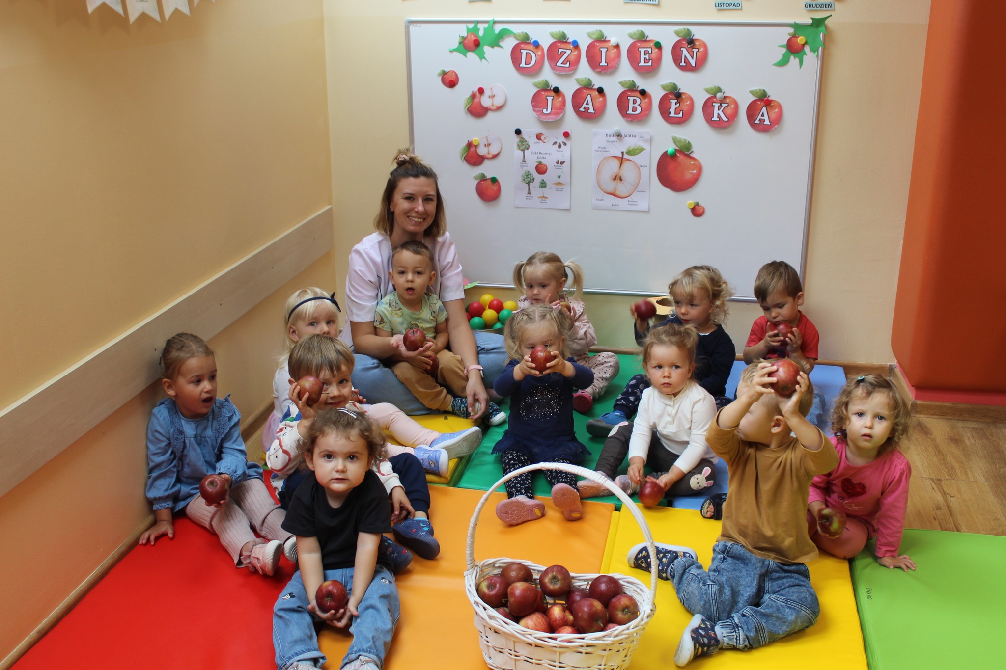 Pierwsze tygodnie września skupione były na wspólnych zabawach o charakterze integracyjnym i uspołeczniającym. W naszej placówce odbyły się rozmaite dni tematyczne, które na dobre wpisały się w kalendarz wydarzeń żłobkowych. 20 września „Dzień Kropki”, czyli czas na kropkowe zgadywanki i poszukiwanie okrągłych przedmiotów w naszym otoczeniu, 28 września „Dzień Jabłka”, w którym to dzieci miały okazję poznać różne odmiany jabłek, czy podczas zajęć kulinarnych- „Kuchcikowa”- samodzielnie wycisnąć sok z jabłek. „Dzień Chłopaka”, który przypada 30 września upłynął w wesołej i pełnej atrakcji atmosferze. Nie zabrakło również zajęć w plenerze z elementami sensoplastyki.